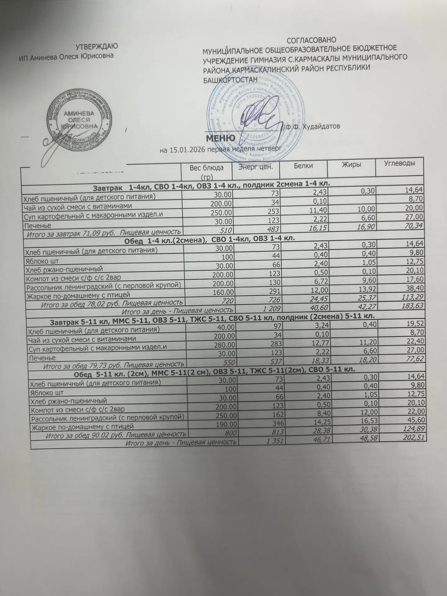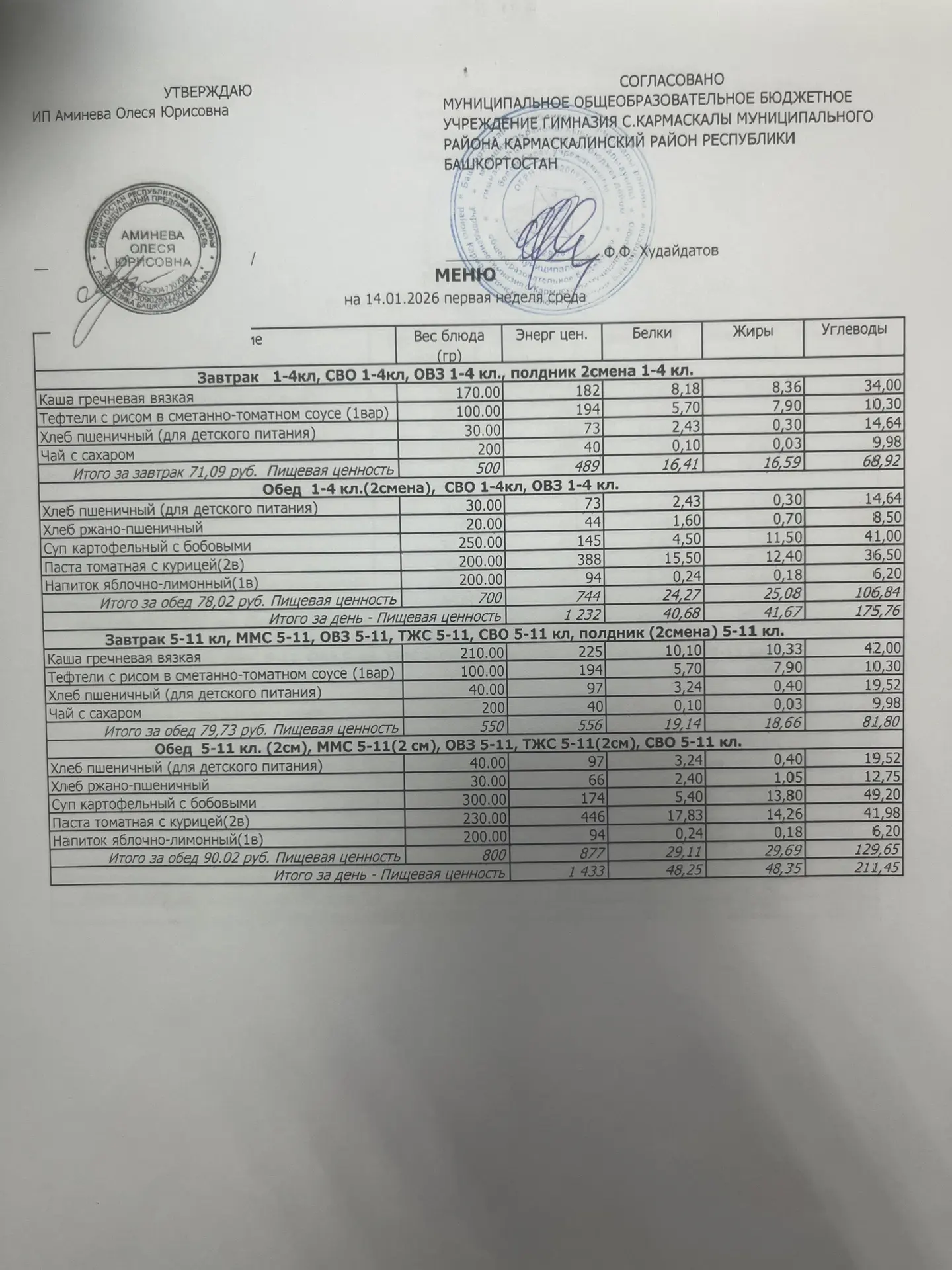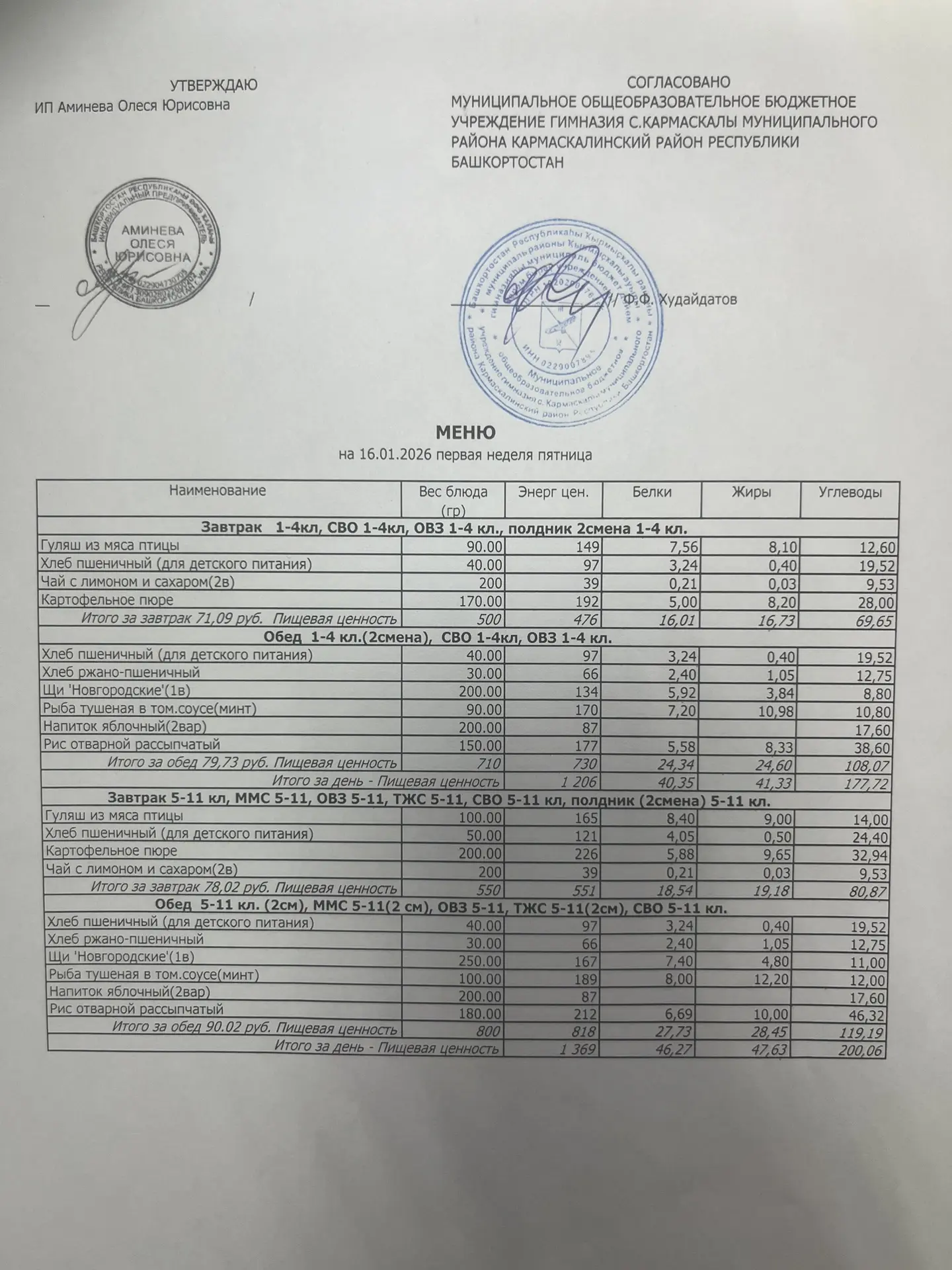 Меню филиала МОБУ гимназия с.Кармаскалы СОШ с.Николаевка