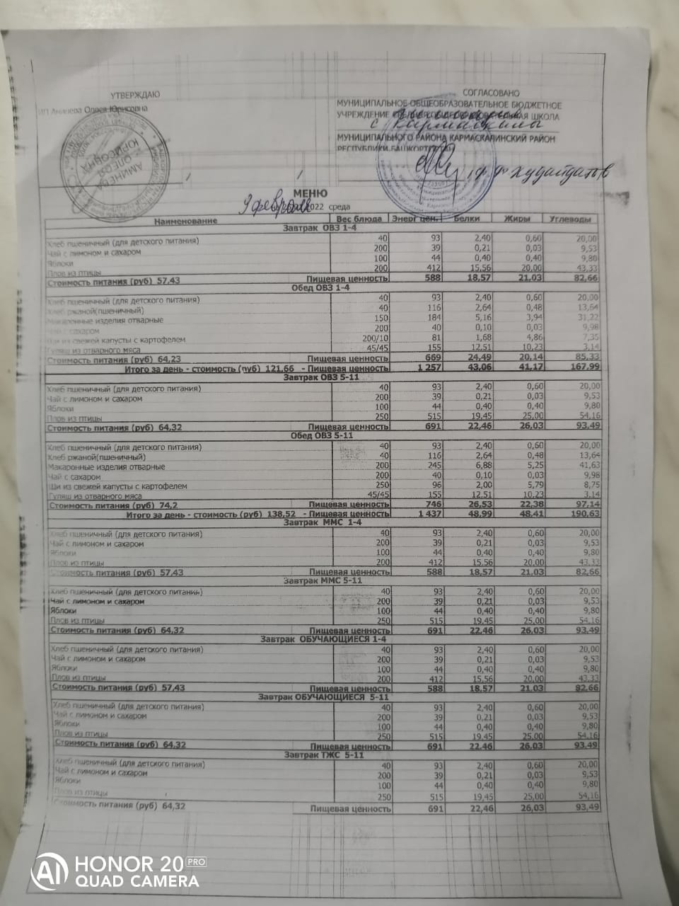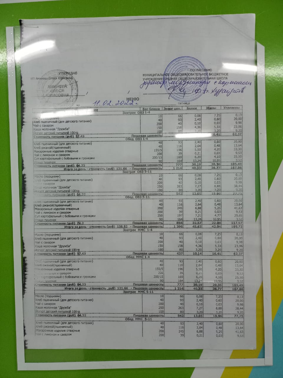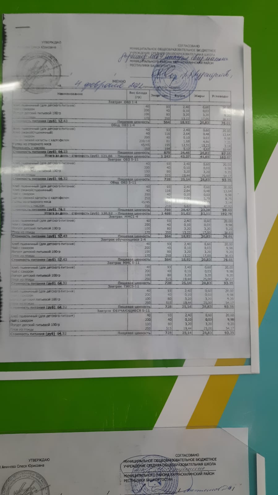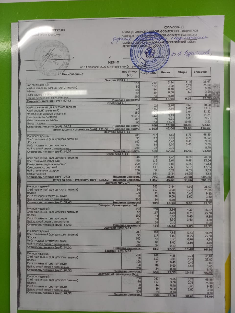 Стоимость школьного питания