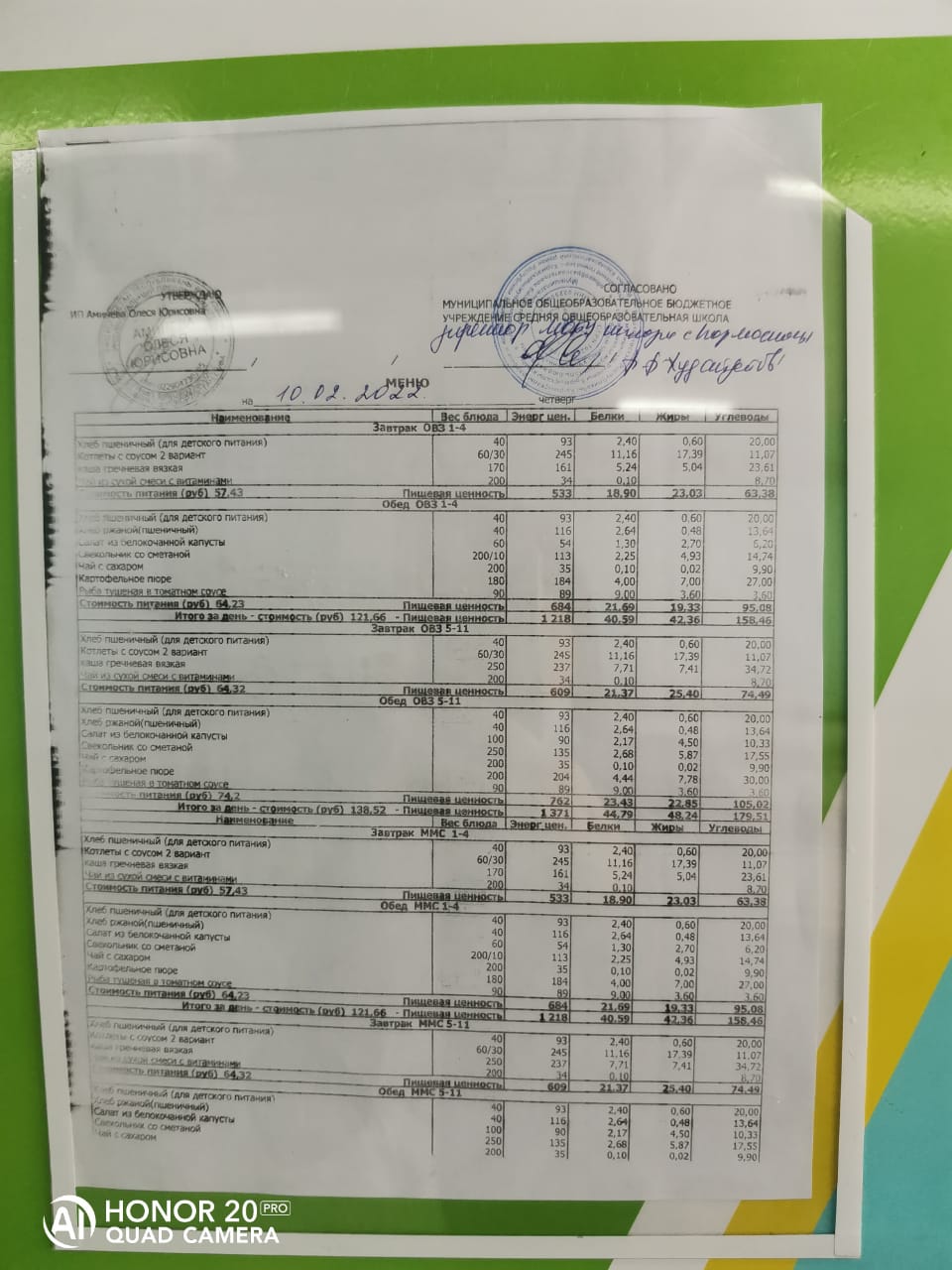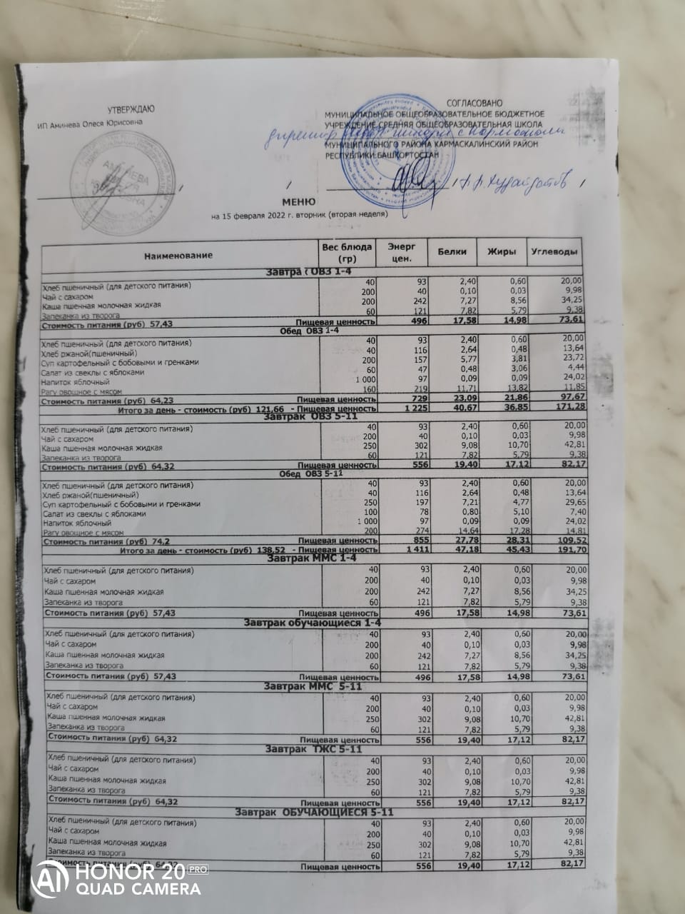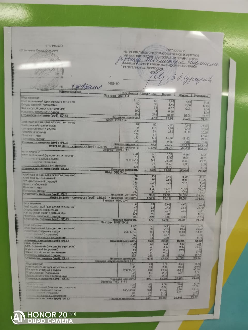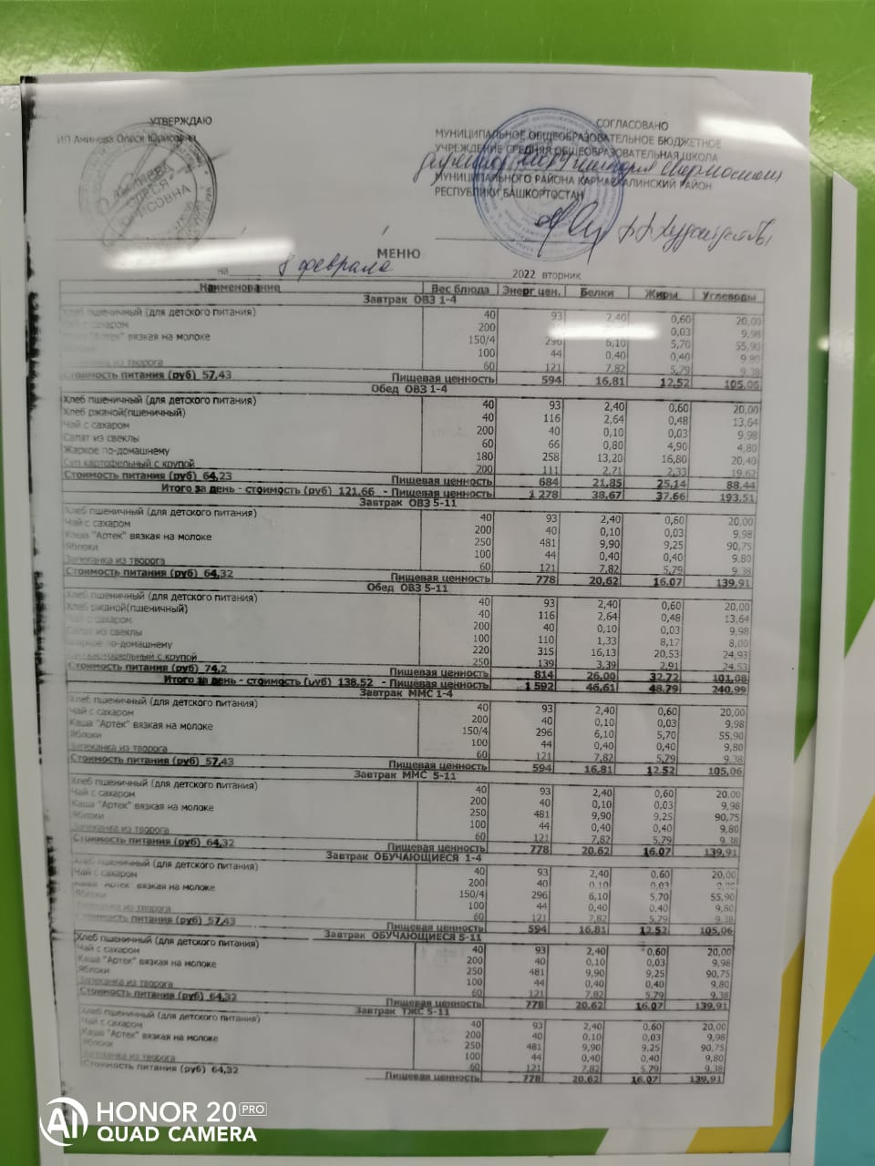Стоимость школьного питания