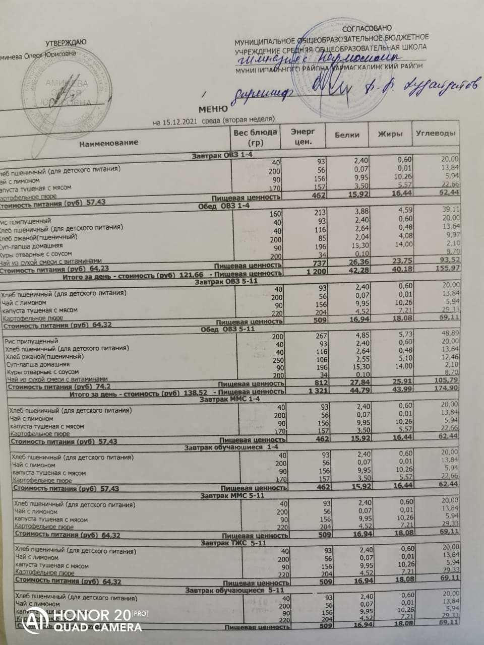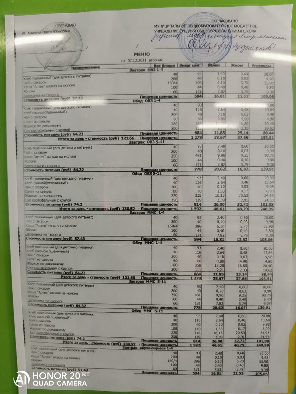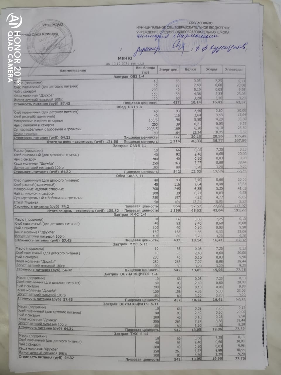 Стоимость школьного питания