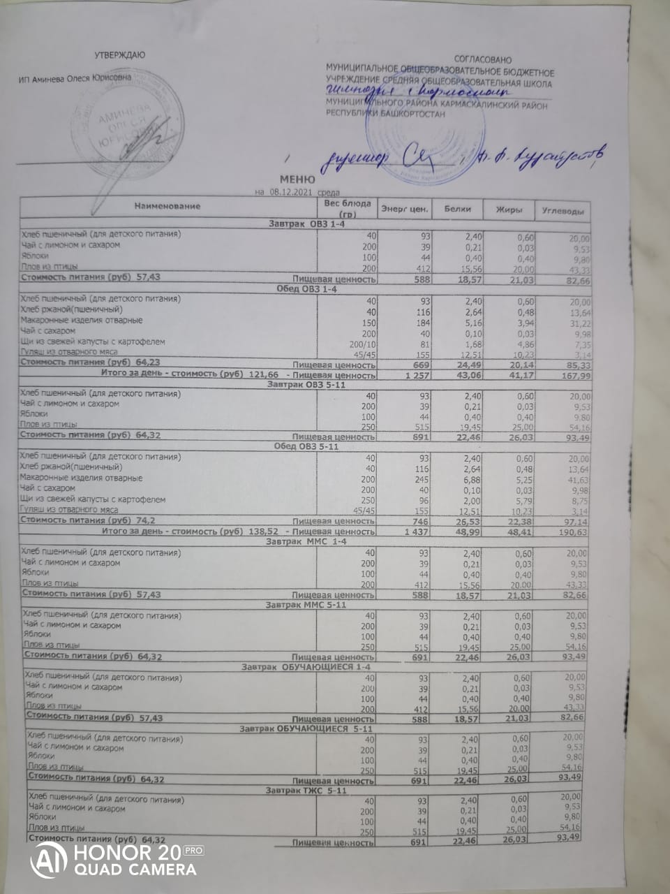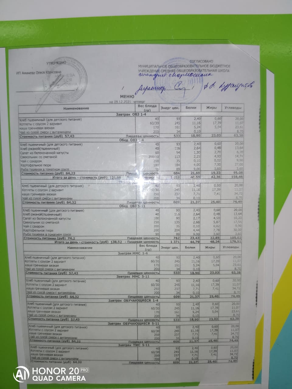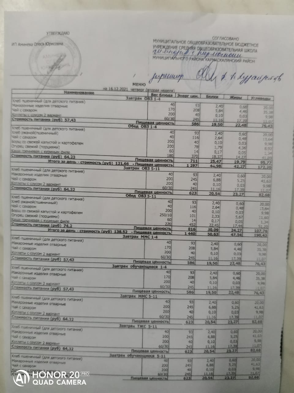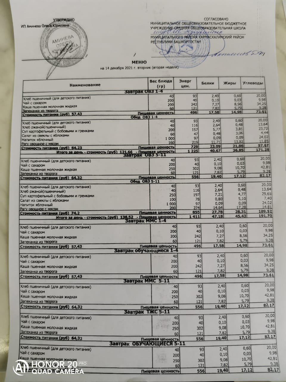 Стоимость школьного питания