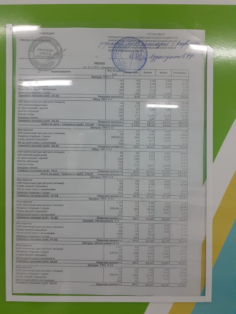 Меню филиала МОБУ гимназия с.Кармаскалы СОШ с.Николаевка