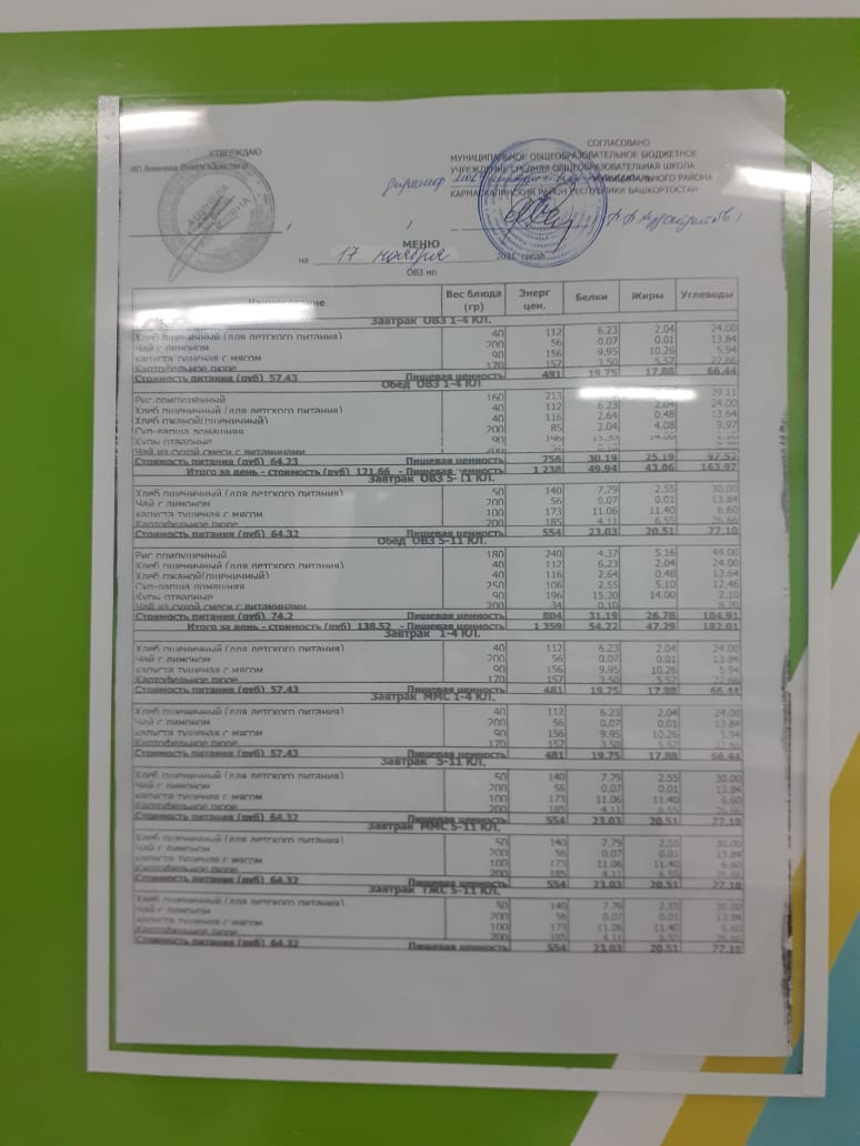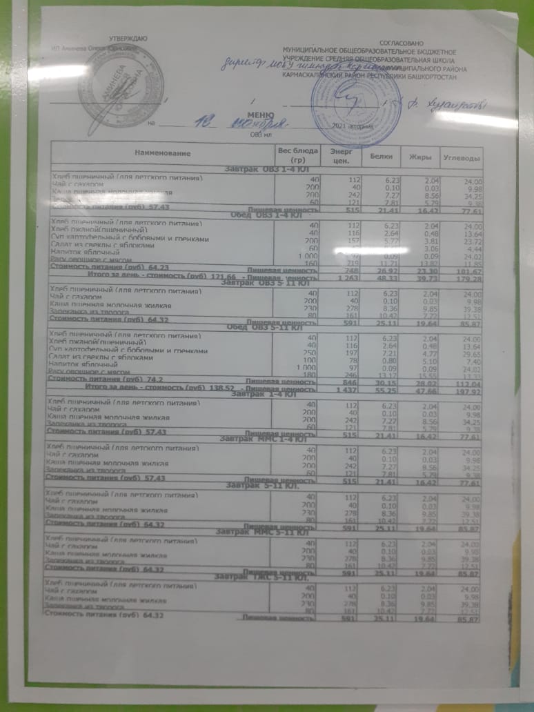 Меню филиала МОБУ гимназия с.Кармаскалы СОШ с.Николаевка