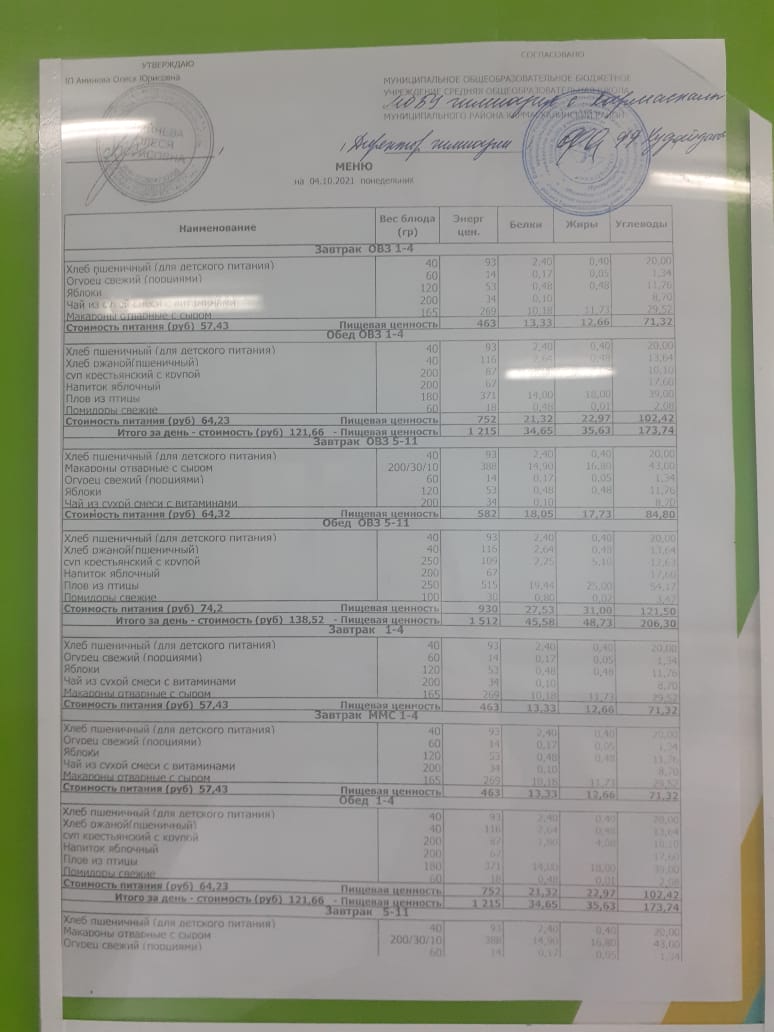 Стоимость школьного питания